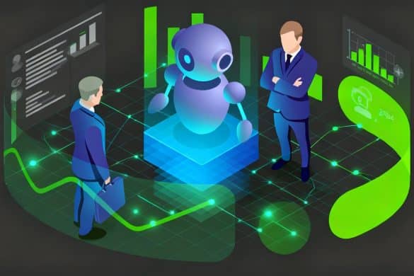 wo professionals discussing with an AI agent represented by a humanoid robot on a green background